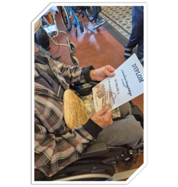Fot. 8: Mieszkaniec trzymający dyplom i nagrodę za zajęcie 3. miejsca w turnieju.