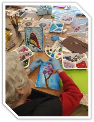Fot. 10: Mieszkanka tworząca obraz z guzików i farb. Fot. 11: Mieszkanki prezentujące swoje gotowe dzieła.